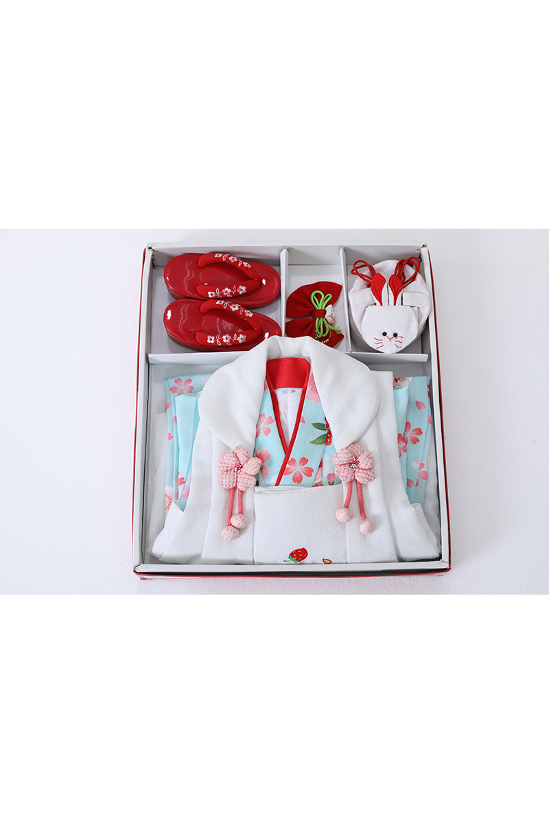 白のちゃんちゃんこに、カラフルな桜や苺の刺繍が施されたキレイな水色のお被布です。白・ピンク・チェリーピンクの花々の色彩が立体的に見える可愛いらしさいっぱいのデザイン。