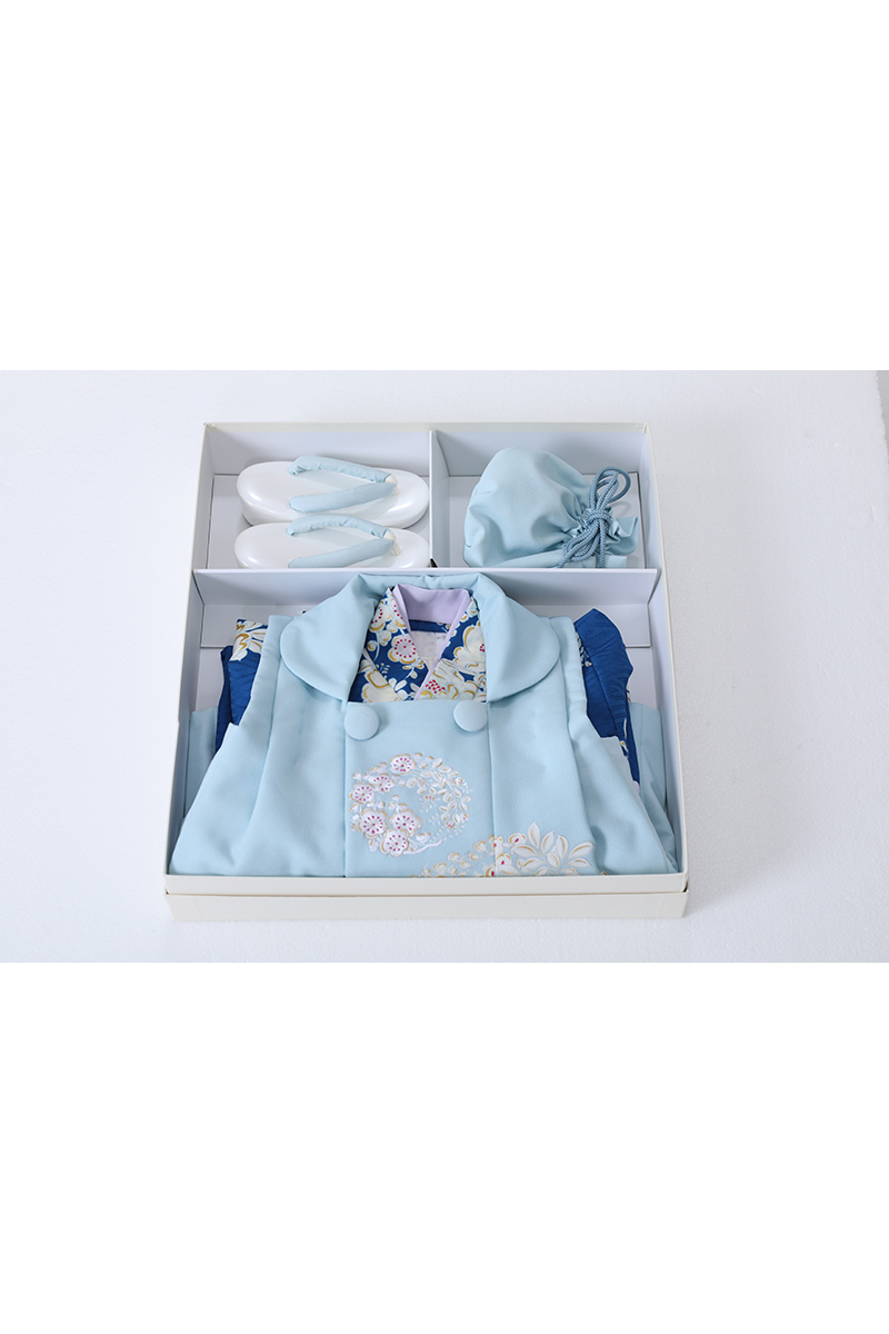 今期、人気アパレルブランド「Natural Beauty」から新発表された七五三女児のお被布スタイルは、鮮やかなブルーの着物と爽やかな水色のちゃんちゃんこのコントラストが美しい古典柄。一見ブーケや花冠に見えるような花紋柄が斬新です?。