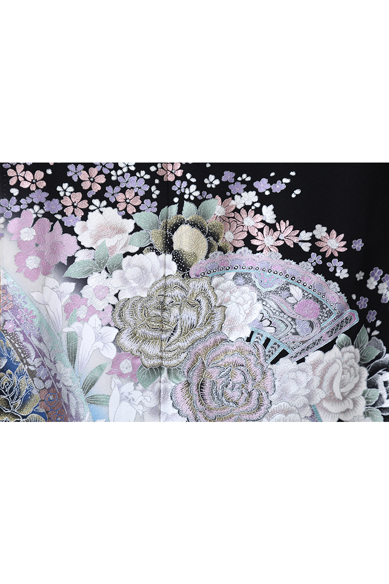 桂由美デザインの白銀箔の上品な花柄留袖。ポイントのバラには刺繍を施し、立体感と光沢を持たせ、百合や桜、蘭の花々が彩りを添えます。鮮やかなブルーのグラデーションが全体の白や薄ピンクの色調と非常にマッチしています。
